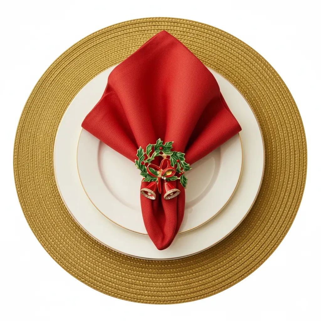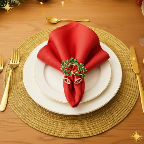 Includes: • Gold charger plates in braided linen (15 in) — handcrafted texture with a refined shimmer and heat resistance. • Red napkins made from 100% cotton (16×16 in) — soft to the touch, beautifully draped, and highly durable. • Gold napkin rings (1.6 in) — bell-shaped design with a luxurious finish and festive charm.