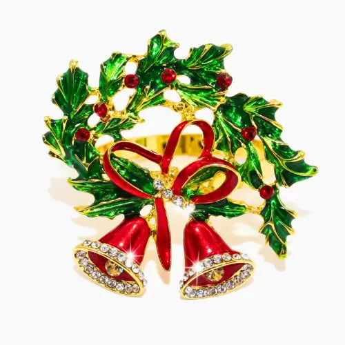 Gold braided charger plates, red napkins, and gold napkin rings shaped like Christmas bells, a set that transforms your table into a luxurious and inviting holiday scene.